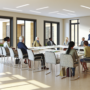 Assemblea condominiale in corso in una sala riunioni moderna con condomini seduti attorno a un tavolo